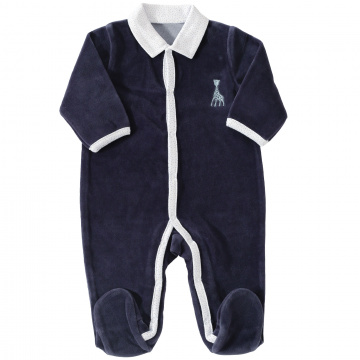 Een zacht en schattig Sophie de giraf boxpakje! Dit velours boxpakje is donkerblauw en heeft lange mouwen, voetjes en een kraagje. De drukknoopjes over de gehele lengte tot aan de voetjes bieden extra gemak bij het verschonen.